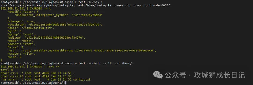 <pattern>:指定要操作的主机或主机组,例如 all、webservers。-m copy:指定使用copy模块。src:源文件路径,必须是控制节点上的文件。dest:目标路径,指定文件在目标主机上的存放位置。owner:文件所有者。group:文件所属组。mode:文件权限。content:直接指定文件内容。基础用法示例