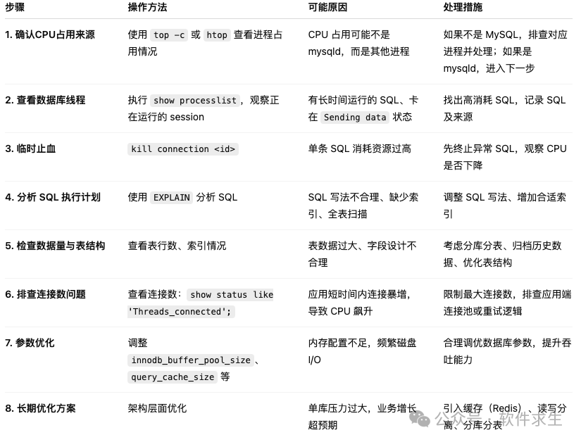 用 show processlist 找出消耗资源的 SQL。3)SQL 优化与索引调整