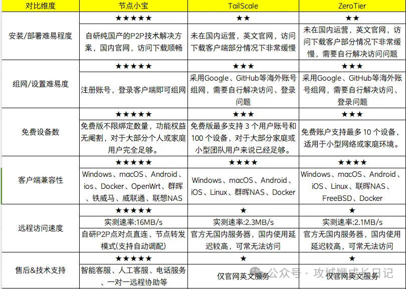 以下是国产自研的节点小宝,以及国外的TailScale、ZeroTier三款方案的横向对比。简单来说,虽然三款方案都支持在没有公网IP、不调整路由器/网络设置的情况下,通过安装、登录软件客户端实现远程访问,但总体而言节点小宝最具优势。