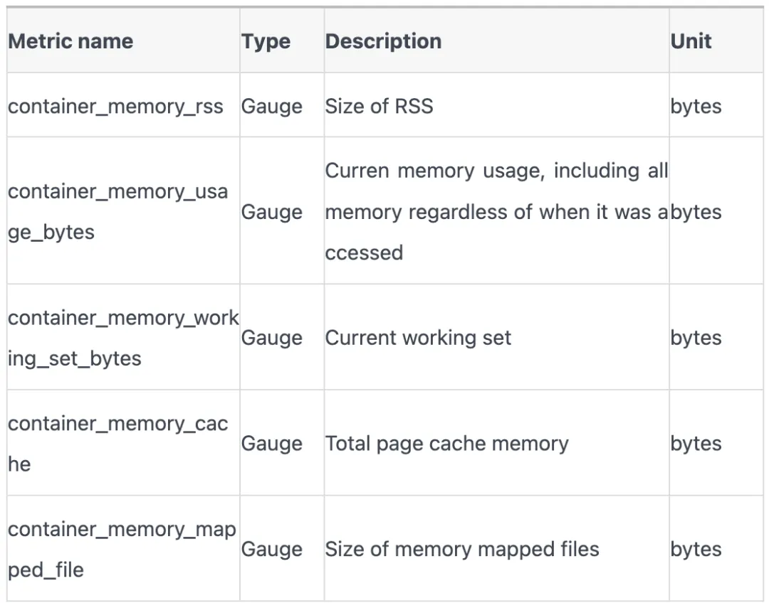 K8s中监控数据主要来源是 cadvisor, 容器内存使用量的相关指标有以下: