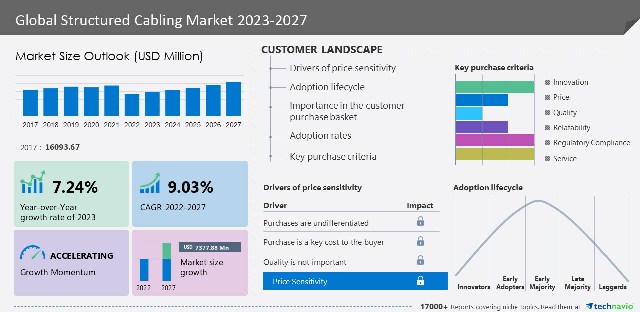 结构化布线市场将经历显着增长,预计从2022年到2027年将增长73.7788亿美元,预测期内的复合年增长率(CAGR)为9.03%。