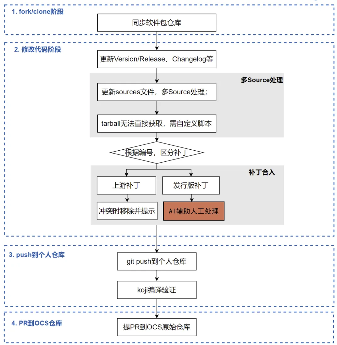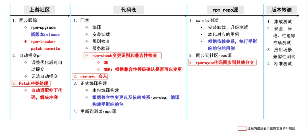这套从上游跟踪到代码同步的全流程自动化维护工具平台,主要包括5个部分及对应的工具,其中红色标识的部分通过LLM/AI辅助进一步提升效率和质量。