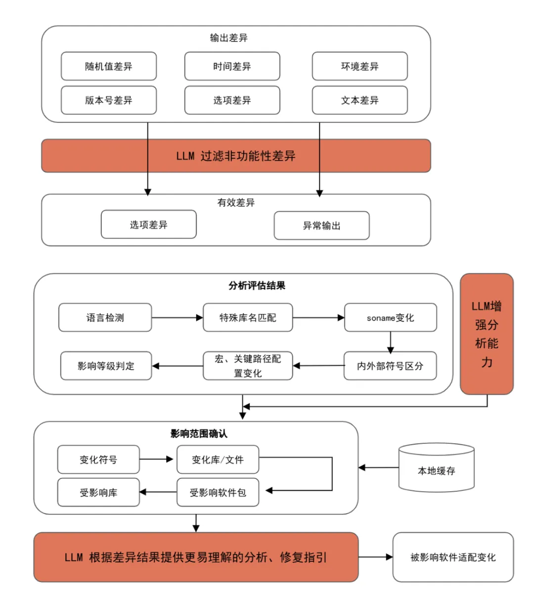 rpm-check结合大模型的分析能力,对结果进行辅助分析评估:比如ABI/API的变化,会先经过内外部符号判定,判断该变化为内部变化还是外部变化;然后经过大模型强化的评估算法确定其影响等级;最后根据评估结果确认影响范围。