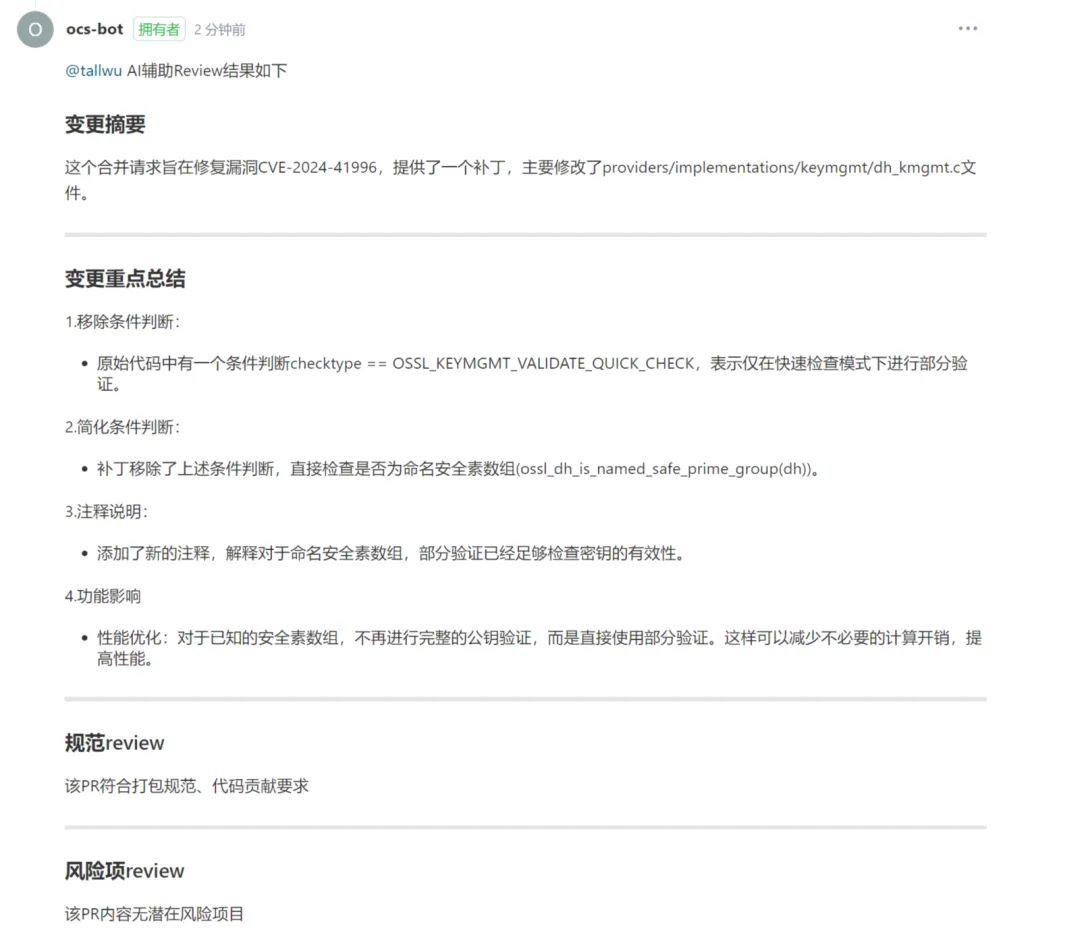 利用大模型给出PR的总结,同时检查代码是否符合规范,并找出可能潜在的风险项,让maintainer把精力放在review代码的逻辑上。