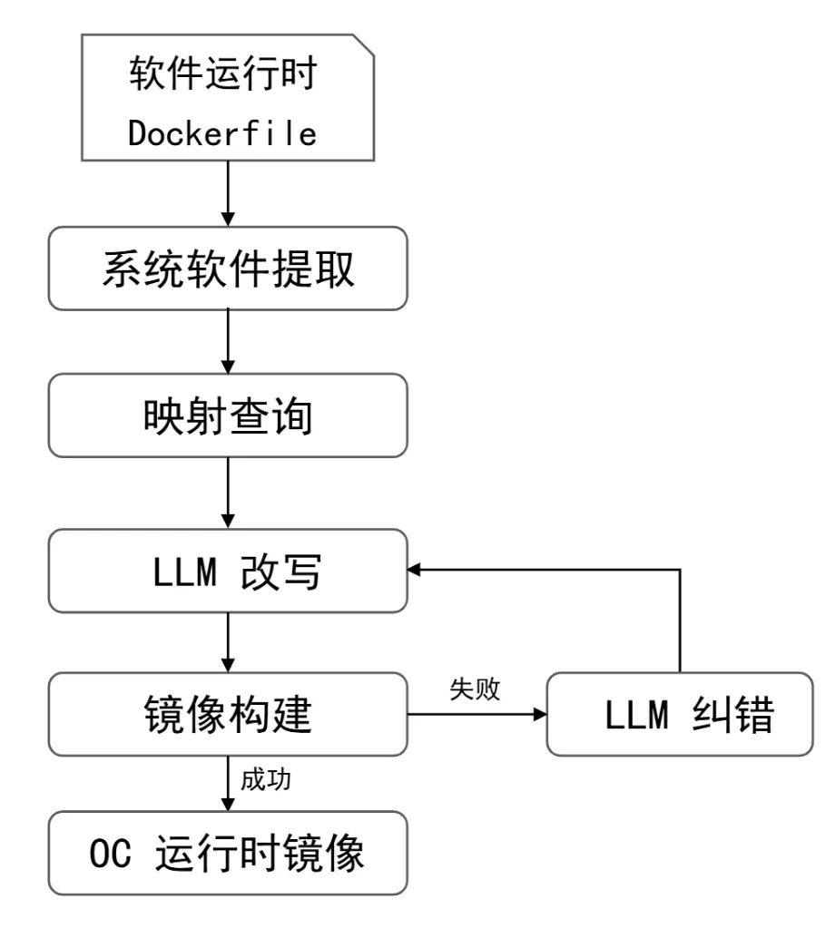 基于大模型的语义理解能力,研发对应的基础镜像转换工具,通过建立操作系统软件包映射,即可精确提供系统依赖,通过大模型完成 Dockerfile 语义理解和改写,建立自动化工作流:“映射查询 —— 改写 —— 构建 —— 纠错”,将基于 debian/alpine 的 dockerfile 转换为 基于opencloudos 镜像,然后制作容器镜像。