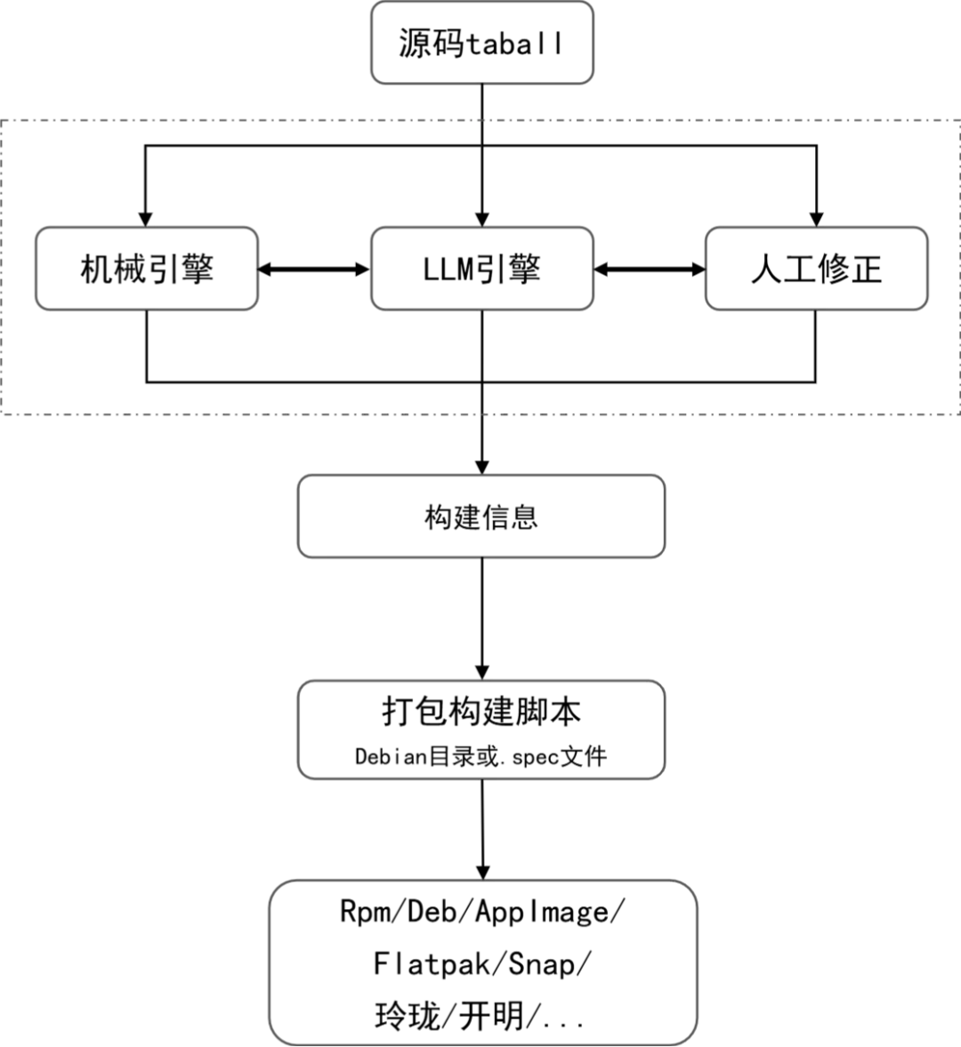 通过分析大量开源软件,我们发现绝大部分软件的构建,至少使用一款构建系统,因此通过解析构建系统的脚本或配置文件,获取软件信息、构建依赖等,有可能自动生成发行版构建脚本(例如构建rpm的.spec),对于复杂的原始构建脚本例如configure,使用大模型进行解析。