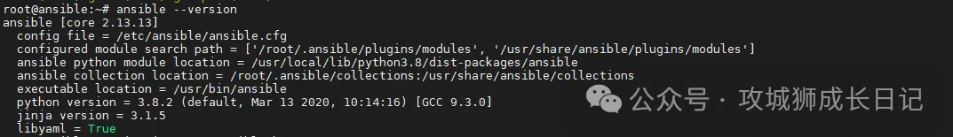 安装完成后,运行以下命令验证 Ansible 是否安装成功: