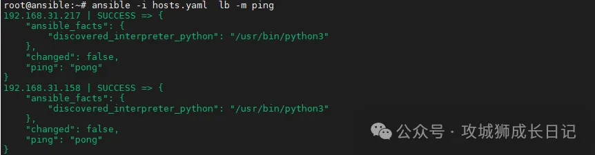 这条命令会对所有主机执行 ping 模块,测试主机是否在线。