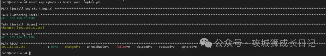 这条命令会按照Playbook中定义的顺序在web组的目标主机上安装和启动 Nginx。如下图所示: