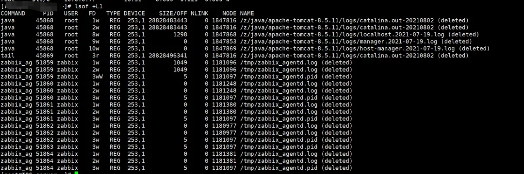 从结果可以看出,有一个28G左右的大日志文件,删除了,但是空间没释放,这是很常见的一种情况。