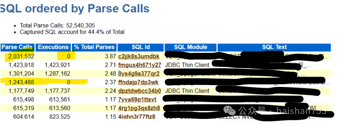 刚开始的时候我发现了这些异常,解析后0次之行的SQL,很可能是这些SQL存在语法问题。后来用户那边确认是自己的应用框架存在BUG,此类问题一直存在,在没有卡顿的时段里也会存在这样的情况。