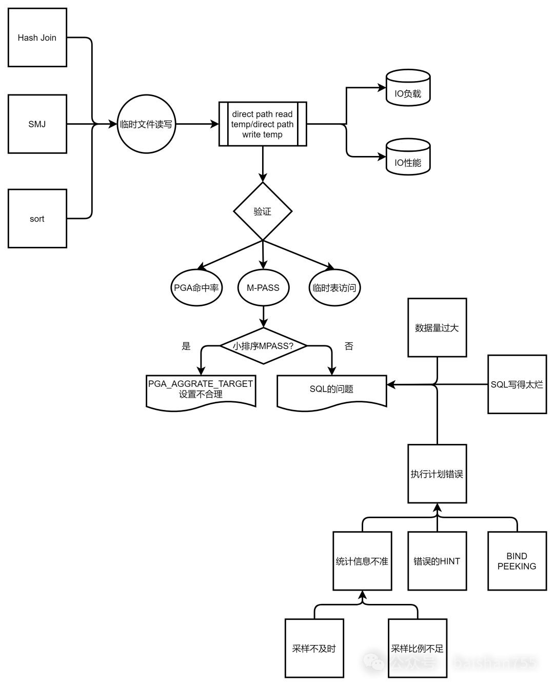 比如上面的一个关于direct path read temp/direct path write temp过多引发系统问题的知识就需要理解Oracle直接路径读写原理的专家经过梳理才能够比较清晰地呈现出来。有了这张图,才能够编制出有价值的算法来分析此类问题,虽然说这张图还只是很初级,还只是把一些常见的问题包含在内。在构建算法之前,首先要把分析要素都指标化了,否则算法也是巧妇难为无米之炊。