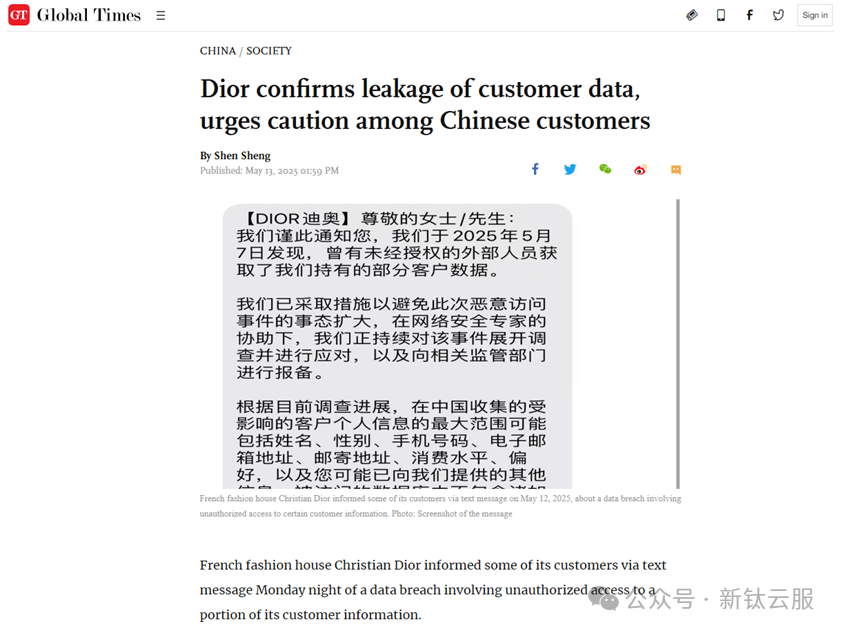 2025年5月12日,奢侈品巨头路威酩轩(LVMH)旗下核心品牌迪奥(Dior)在中国市场发生严重数据泄露事件,引发广泛关注。