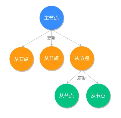 在 Redis 中一个主节点可以拥有多个从节点,一个从节点也可以是其他服务器的主节点,如下图所示: