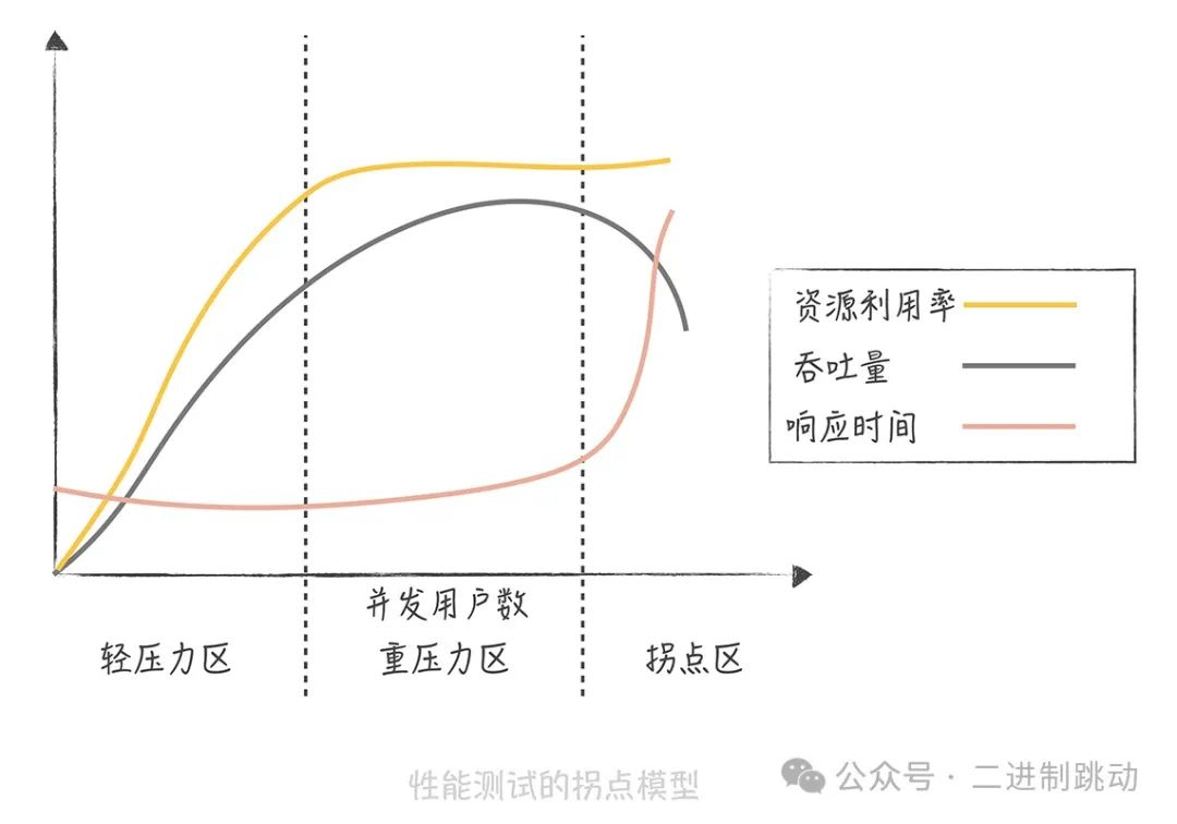 从图中可以看出,当并发用户数处于轻压力区时,响应时间保持平稳,吞吐量与并发用户数呈线性关系。而当并发用户数进入重压力区时,系统资源接近极限,吞吐量开始下降,响应时间略有上升。进一步增加压力时,系统进入拐点区,超负荷状态下吞吐量下降,响应时间急剧上升。因此,评估系统性能时,我们通常通过压力测试来找到系统的“拐点”,以了解系统的承载能力,并定位瓶颈,进行持续优化。
