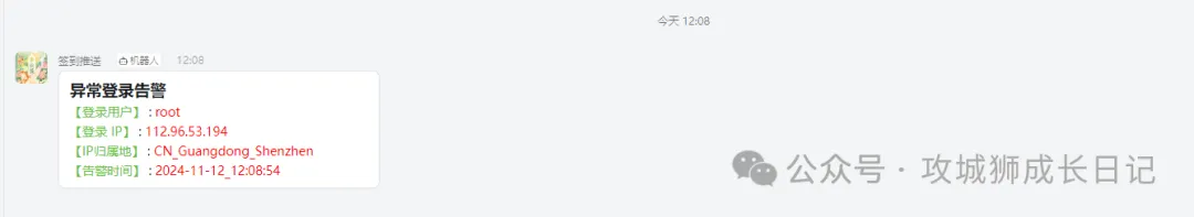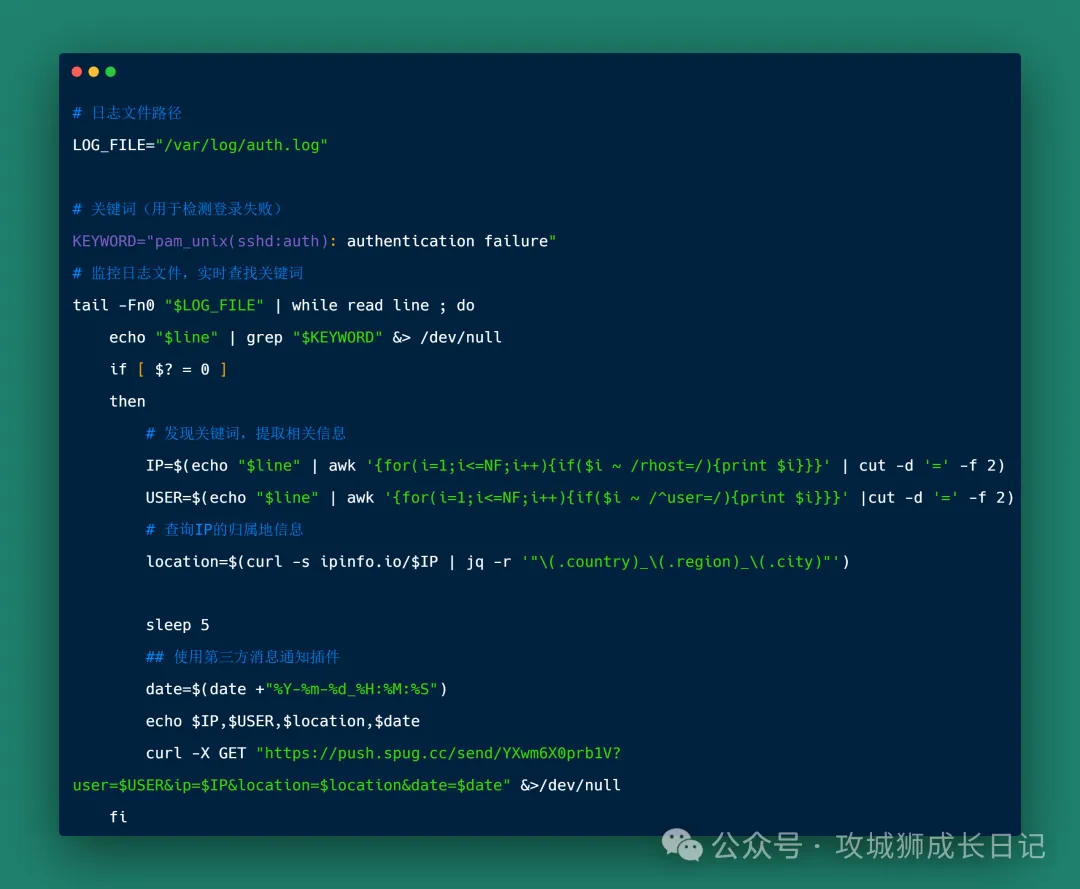 这个脚本的主要任务是持续关注 /var/log/auth.log 文件。一旦发现有异常登录的情况,它会自动收集尝试登录的用户名以及该用户的IP地址。接着,它会利用 ipinfo.io 来查找这些IP地址的具体位置信息。最后,通过一个第三方的通知工具,比如钉钉,将这些重要信息即时发送给您,确保您可以及时了解到任何不寻常的活动。
