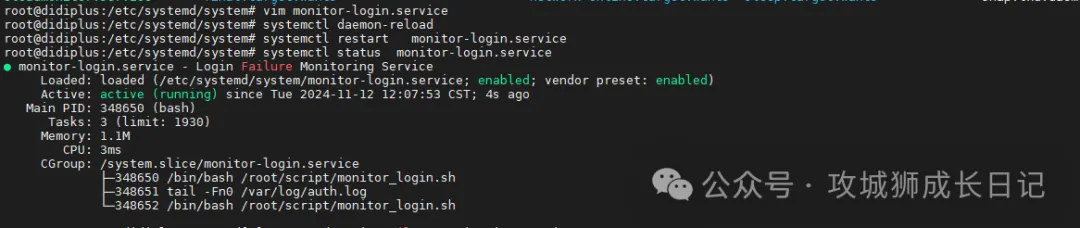 [Unit] Description=Login Failure Monitoring Service After=network.target [Service] ExecStart=/root/script/monitor_login.sh Restart=on-failure User=root # 环境变量设置(如果有) Environment="LOG_FILE=/var/log/auth.log" [Install] WantedBy=multi-user.target1.2.3.4.5.6.7.8.9.10.11.12.13.