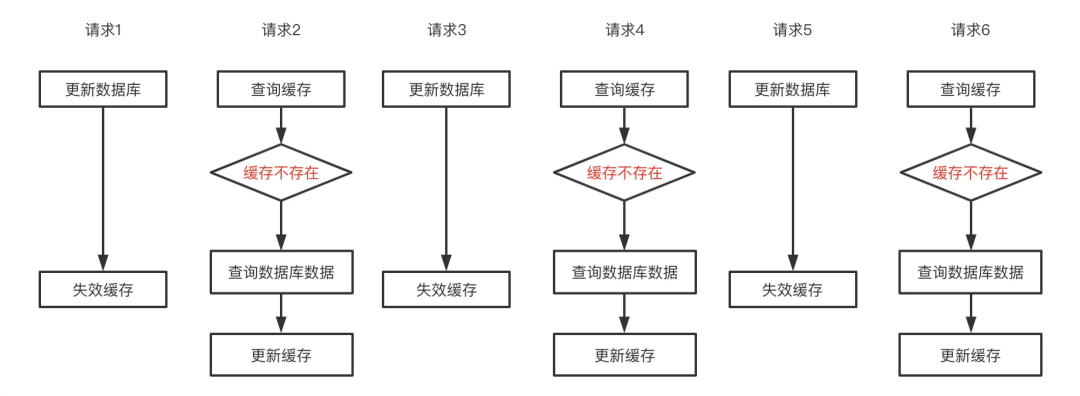读请求不命中缓存,写请求处理完之后读请求才回写缓存,此时缓存不一致