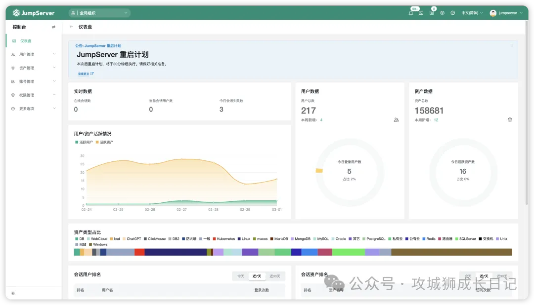 支持多协议:Jumpserver 支持 SSH 和 RDP 协议,可同时管理 Linux 和 Windows 系统。细粒度权限控制:支持基于角色的访问控制(RBAC),并提供权限审批流程。全面的审计功能:提供命令审计、会话录像、操作日志等功能,满足合规要求。开放性和扩展性:作为Python开发的开源堡垒机,Jumpserver社区活跃,有丰富的插件可供选择。项目地址:JumpServer[1]