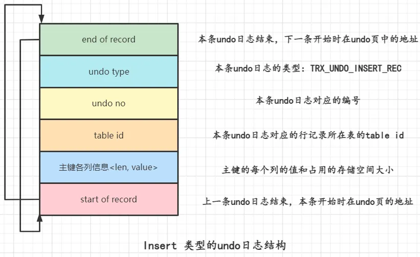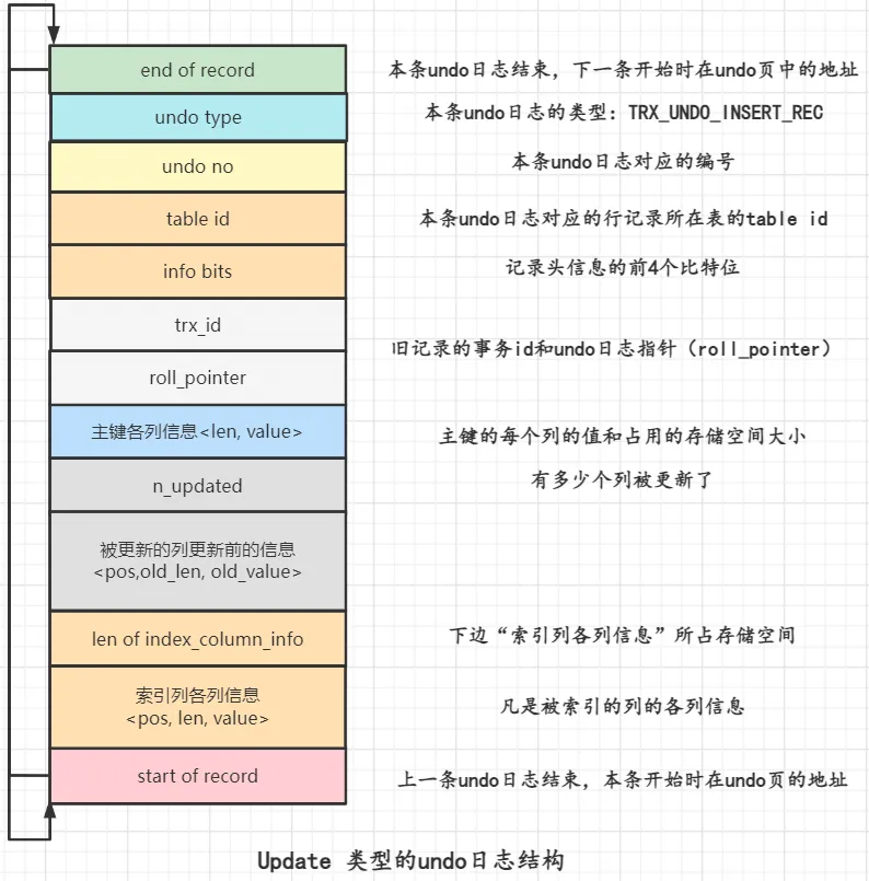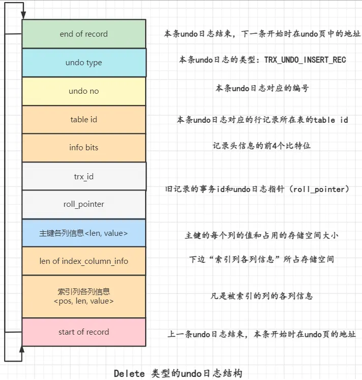 insert操作对应的undo日志delete操作对应的日志 update操作对应的undo日志下面是undo日志的具体结构,其他的不用关注,重点关注图中倒数第二格的 <len, value>,里面包含增删改操作前的具体字段和值,数据库回滚就是通过这些字段和值来进行的。