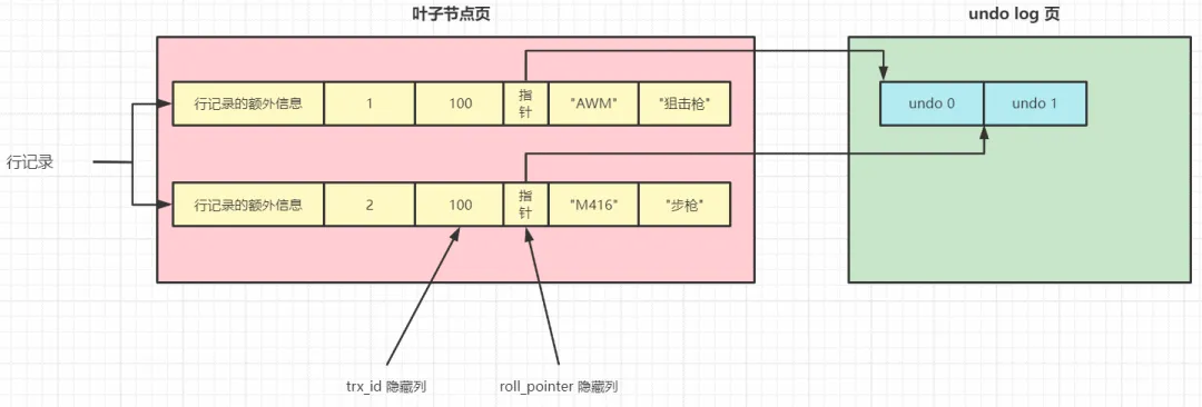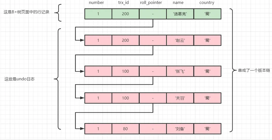 实现:在数据库中,每个数据行都会有一个隐藏的回滚指针(roll_pointer)字段,该字段指向该行的上一个版本(如果存在的话)。这样,通过回滚指针,可以将各个版本连接起来,形成一个版本链。