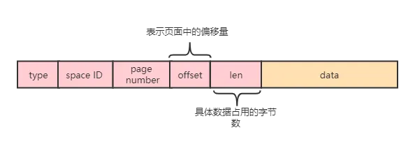 其中 space ID 表示本修改所对应的数据页所在的表空间,page number是所修改的页号,offer是所修改的数据在页中的偏移量。通过这3个信息,就可以在故障恢复时找到要恢复的数据页和数据页中的具体位置。