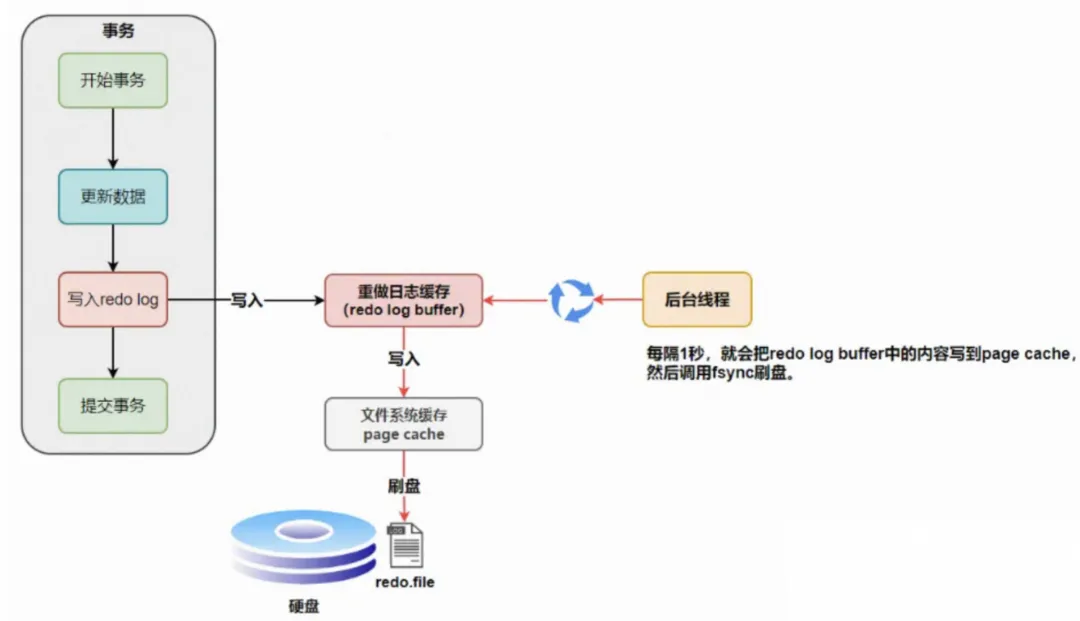 当事务提交时,MySQL会将该事务的所有修改操作按照顺序写入redo log文件中。这个过程称为redo log的刷新(flush)。