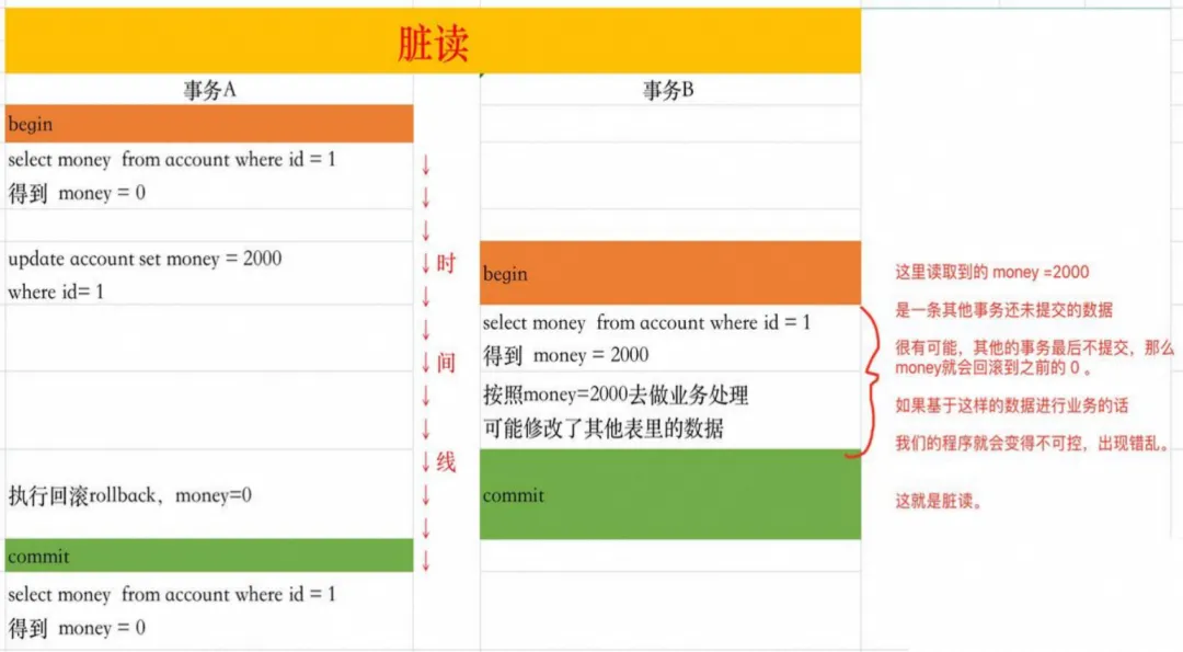 如果事务A最终不提交其修改,那么事务B读取到的mnotallow=2000就是一个“脏读”,即读取到了其他事务还未提交的数据。