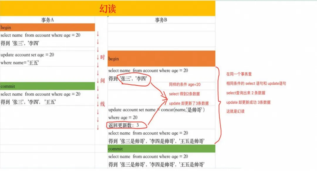 一个事务(通过条件)读取多条记录后,因其他事务的插入或删除,导致再次读取时获得的记录集发生变化。幻读问题通常发生在插入或删除操作频繁的场景中。