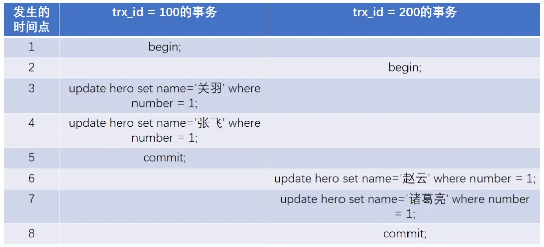 下图呈现了两个事务对数据表修改过程中生成版本链的过程。