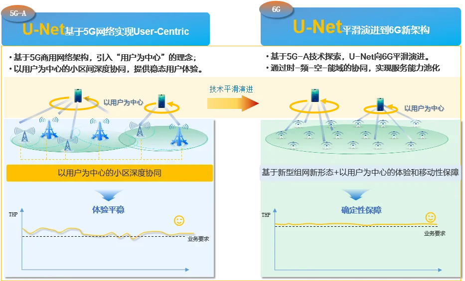 目前阶段CoMP协同要从“以小区为中心”向“以用户为中心”的无感移动性网络演进,构建以用户为中心的网络(U-Net)。通过多小区深度协同、消除小区边界带来的干扰和切换等问题,最终实现终端无感知自由移动,保障用户稳态体验。为平滑演进到6G,实现时-频-空-能域的协同,建立组网新形态做准备。