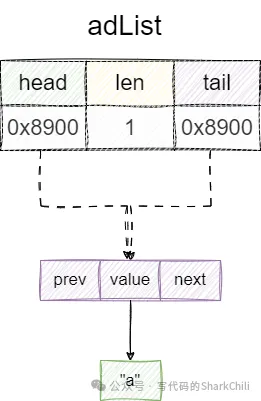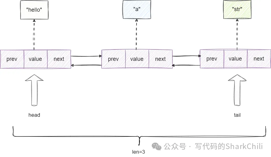 双向链表需要一个头指针和尾指针管理首尾节点,从而实现后续灵活的头插法和尾插法的操作,所以在设计双向链表的时候,我们就需要一个head和tail指针管理链表的首尾节点。同时,为了实现O(1)级别的长度计算,在元素添加或者删除操作的时候,我们还需要一个len字段记录当前链表的长度: