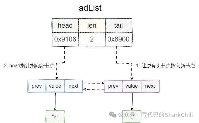若非第一次操作,则初始化一个新节点之后,让这个节点指向原有的头节点,最后让原有的头节点作为新节点的后继即可:
