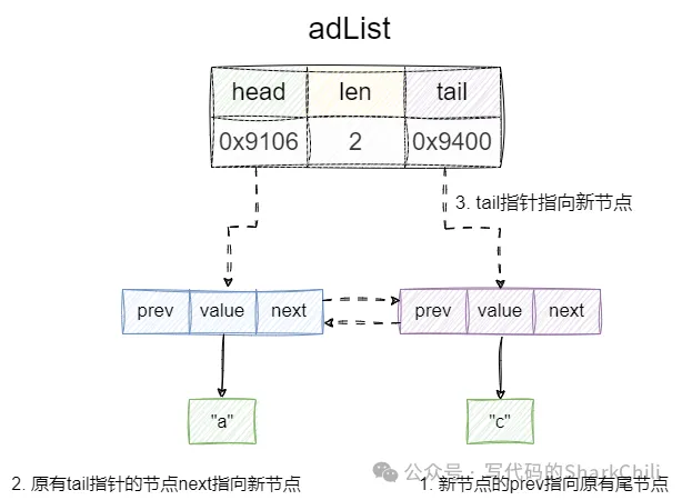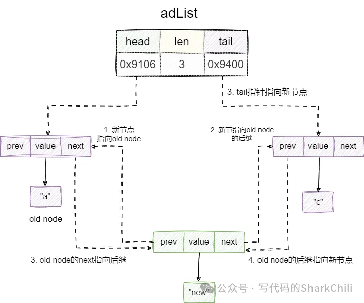 //新节点的前驱节点指向尾节点,然后让原有尾节点指向新节点,最后让tail指针指向新节点