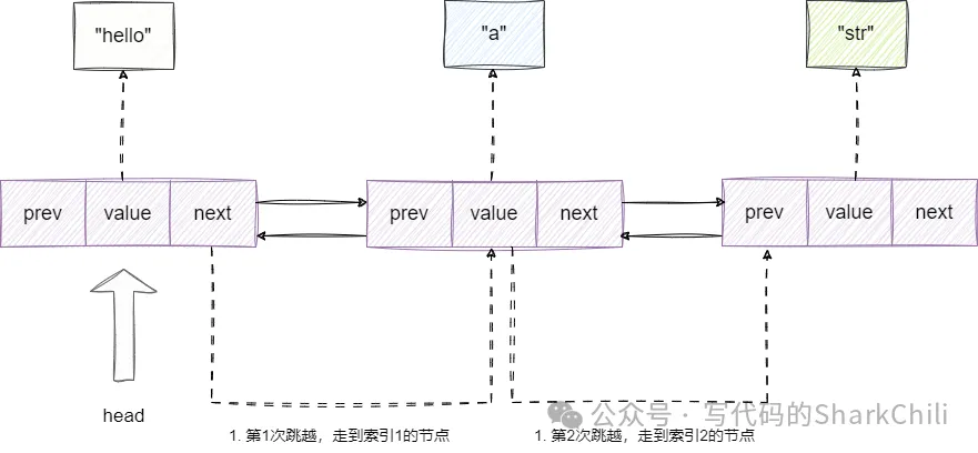 双向链表支持基于索引查找指定位置的元素,操作时间复杂度为O(n),我们以从头查找为例,如果希望查找索引2的元素,也就是第3个元素,它就会从head开始跳越2条,由此走到第3个节点的位置并返回这个节点的指针: