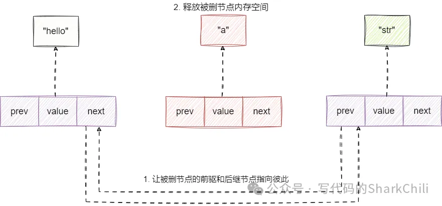 最后一个就是链表删除操作了,操作比较简单,让被删除节点的前驱和后继节点构成关联关系,然后释放当前被删节点,然后减小一下长度即可: