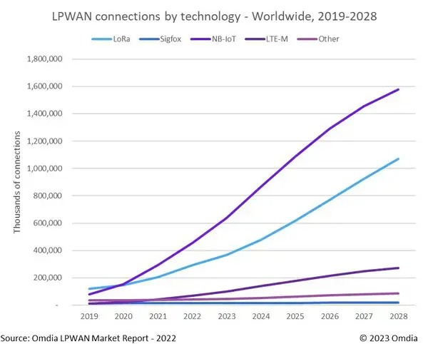 Omdia高级首席分析师Shobhit Srivastava表示,基于蜂窝的NB-IoT和非蜂窝LoRaWAN分别超过其传统竞争对手LTE-M和Sigfox,处于“中端物联网应用的最佳位置”。他说:“由于这两种技术之间存在足够的差异,因此在Omdia的预测结束前,它们都有望在2028年取得成功。”