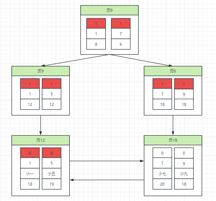 绿色: 绿色框框表示页数,之前已经讲过,数据库的数据是以页的方式存储。红色: 红色框框表示是否是索引还是数据行,1:索引;0:数据。B+树的叶子节点存放的是完整的数据,非叶子节点存放的是索引数据。B+树的子节点可以有多个,这里是只用4条数据模拟,多了难得画。叶子节点的数据是有序的,根据主键id由小到大存储,并且行与行,页与页之间是用双向链表连接的。