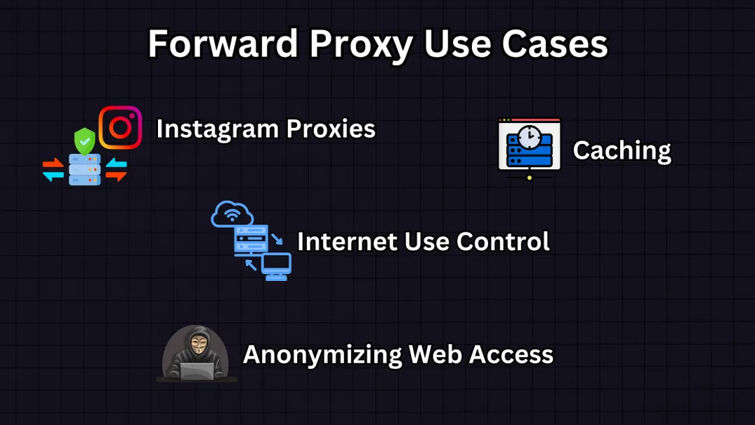 (2) 互联网使用控制和监控 组织使用正向代理来监控和控制员工的互联网使用,阻止访问与工作无关的网站,确保遵守组织政策,并保护网络免受基于 Web 的威胁。