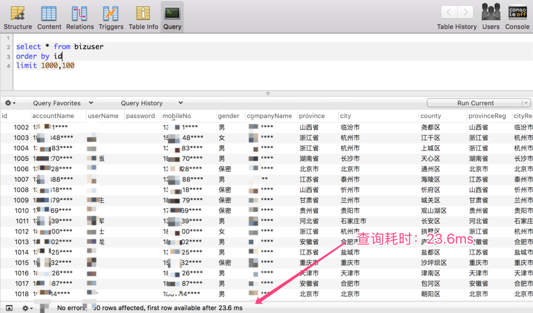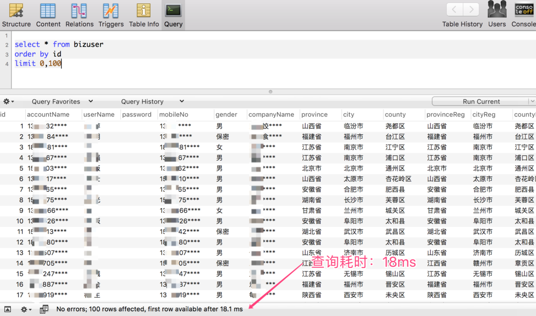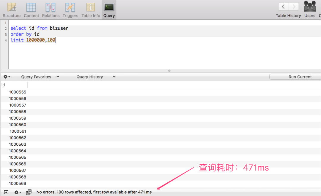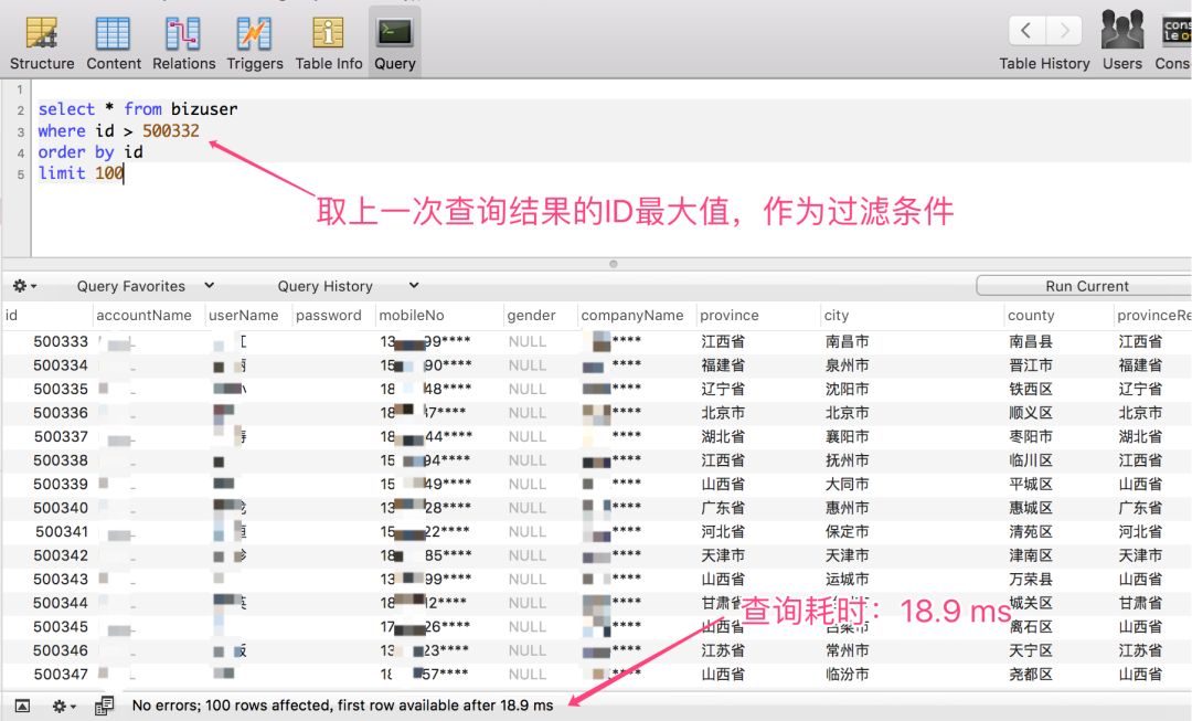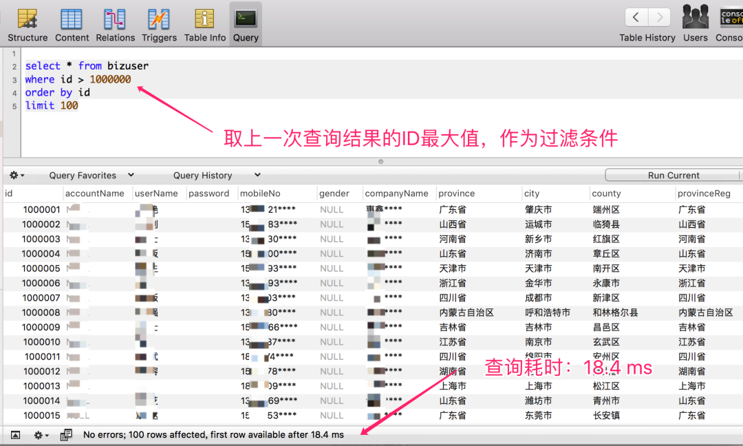 查询 100000~1000100 区间段的数据,仅耗时:18 ms图片