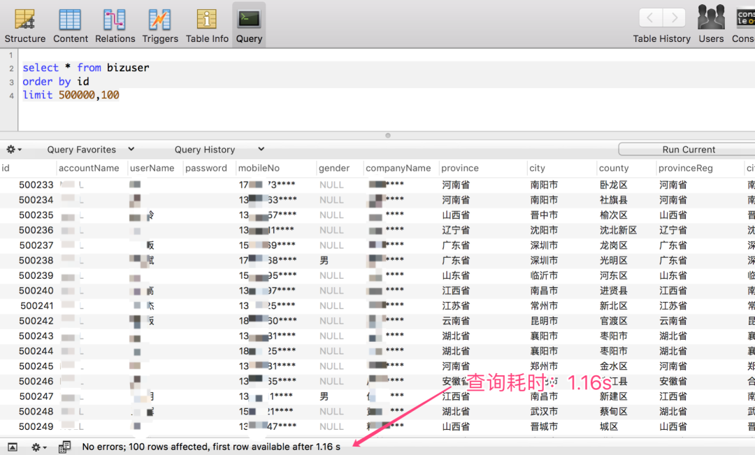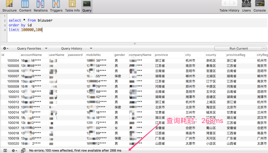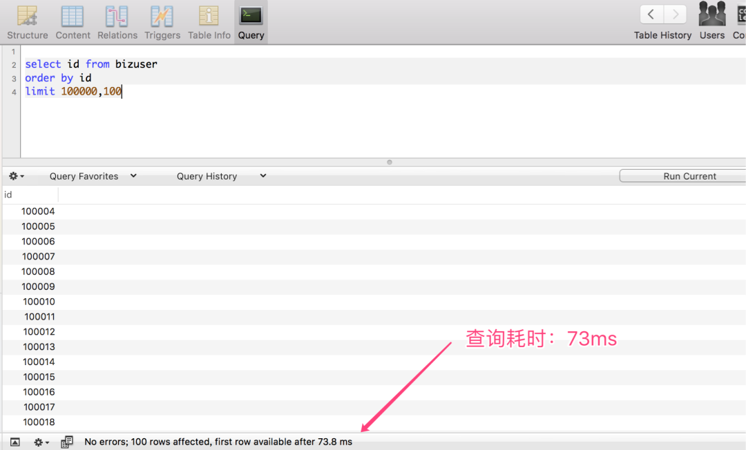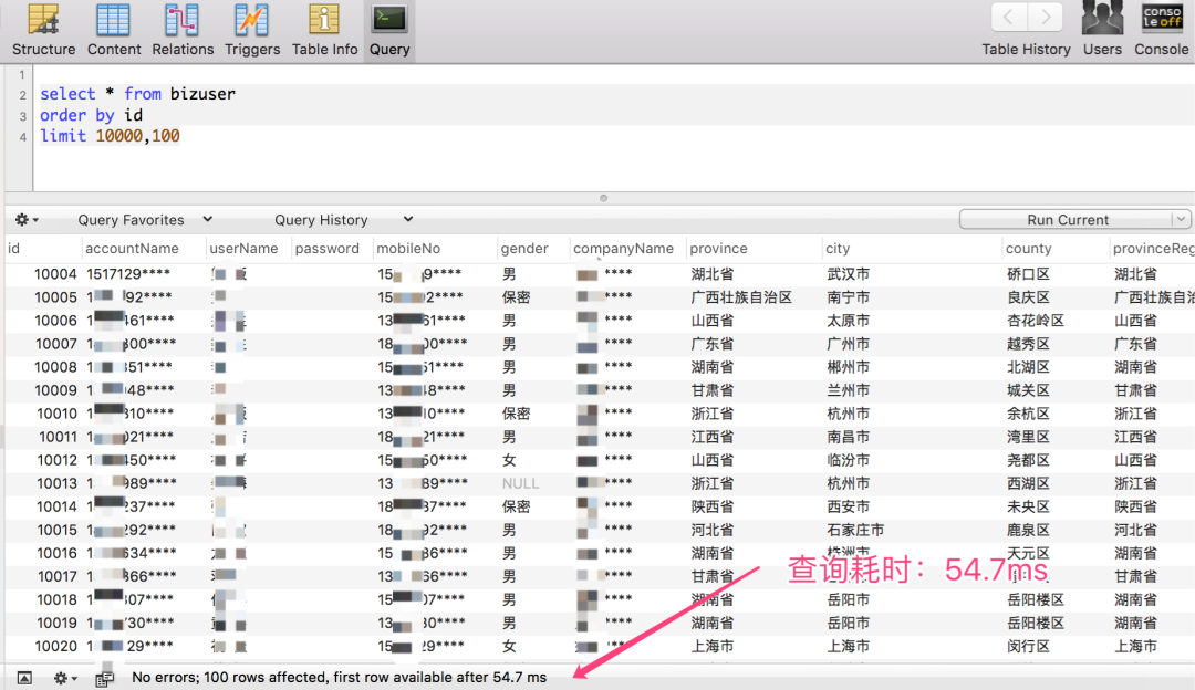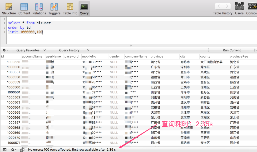 查询 100000~1000100 区间段的数据,仅耗时:18 ms图片
