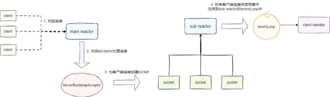 我们希望通过Netty快速落地一个简单的主从reactor模型,由主reactor对应的线程组接收连接交由acceptor创建连接,与之建立的客户端的读写事件都会交由从reactor对应的线程池处理: