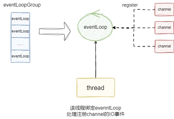 在Netty中,所有channel都会注册到某个eventLoop上, 每一个EventLoopGroup中有一个或者多个EventLoop,而每一个EventLoop都绑定一个线程,负责处理一个或者多个channel的事件:
