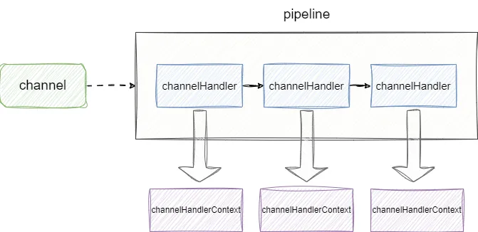 每一个channel的事件都会交由channelHandler处理,而负责同一个channel的channelHandler都会交由pipeline一条逻辑链进行连接,这两者的的关系都会一一封装成channelHandlerContext,channelHandlerContext主要是负责当前channelHandler和与其同一条channelpipeline上的其他channelHandler之间的交互。