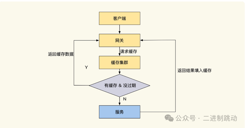 首先来看网关接口缓存功能,也就是利用网关实现一些接口返回内容的缓存,适合用在服务降级场景,用它短暂地缓解用户流量的冲击,或者用于降低内网流量的冲击。具体实现如下图所示: