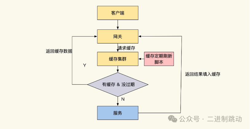 然而,这种方式的选择是经过权衡的,它牺牲了数据的强一致性以换取性能上的提升。同时,缓存机制对性能要求较高,必须确保网关缓存能够处理外部流量的高 QPS(每秒查询数)。为了避免过多的穿透流量,可以定期通过脚本刷新缓存数据。这样,当网关发现有有效的缓存时,就直接返回;如果缓存没有命中,才会请求后端服务,并缓存结果。