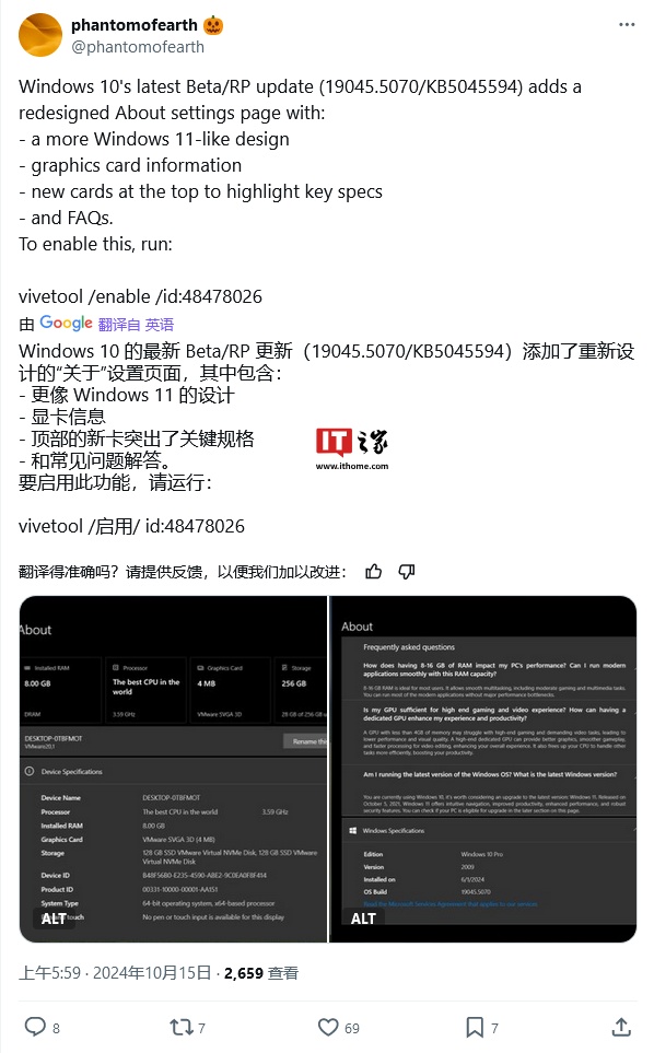 微软 Windows 10 Beta / RP 19045.5070 预览版发布:设置“关于”页效仿 Windows 11,卡片式显示设备规格