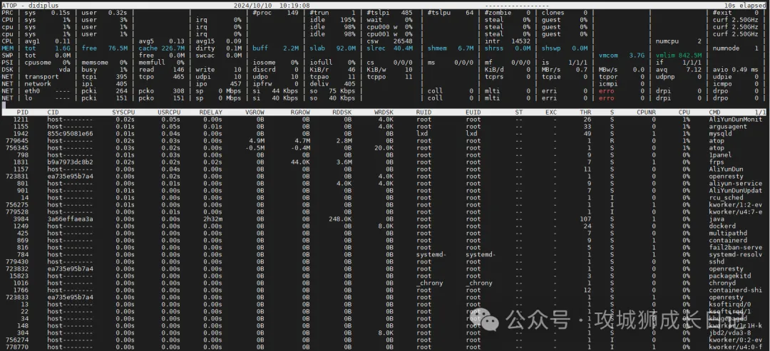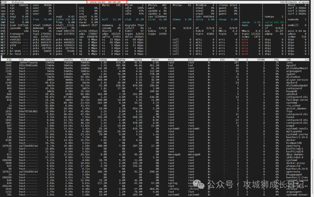 如下图所示,展示了一部分监控指标及其相应数值。需要注意的是,这些数值会依据实际的采样周期和所使用的atop软件版本的不同而有所变化。