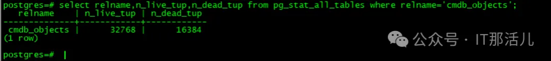 更新后该表会存在16384死行,如业务数据量大,且有频繁的更新操作,该表就会产生高水位。可通过pg_stat_all_tables视图来查询该表中存在的死行、活跃行数。