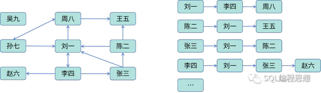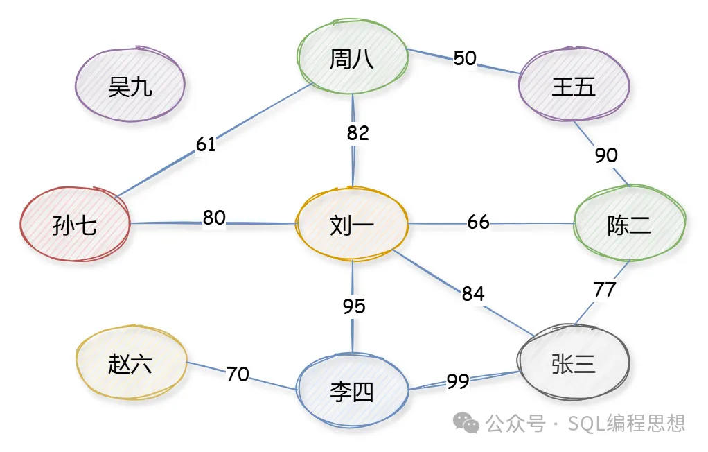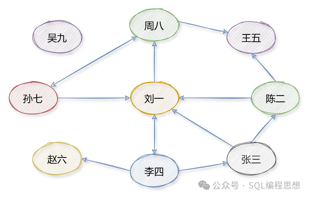 结果显示,“刘一”和“李四”互为粉丝,而“孙七”和“周八”则互相关注。